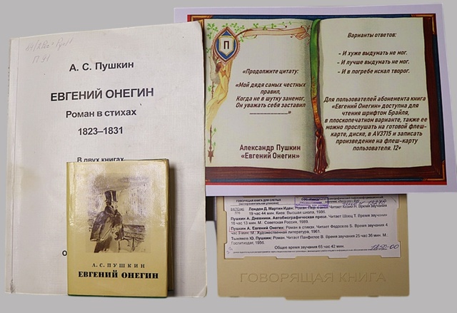 Для пользователей абонемента книга «Евгений Онегин» доступна для чтения шрифтом Брайля, в плоскопечатном варианте, также ее можно прослушать на готовой флеш-карте, диске, в AV3715 и записать произведение на флеш-карту пользователя. 12+