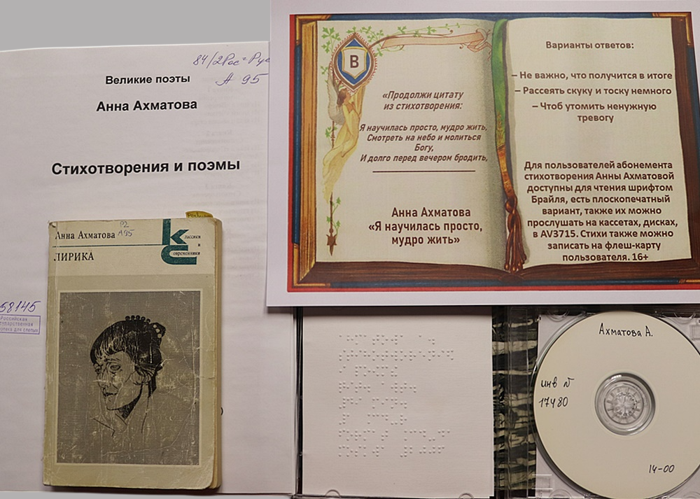 Для пользователей абонемента стихотворения Анны Ахматовой доступны для чтения шрифтом Брайля, есть плоскопечатный вариант, также их можно прослушать на кассетах, дисках, в AV3715. Стихи также можно записать на флеш-карту пользователя. 16+