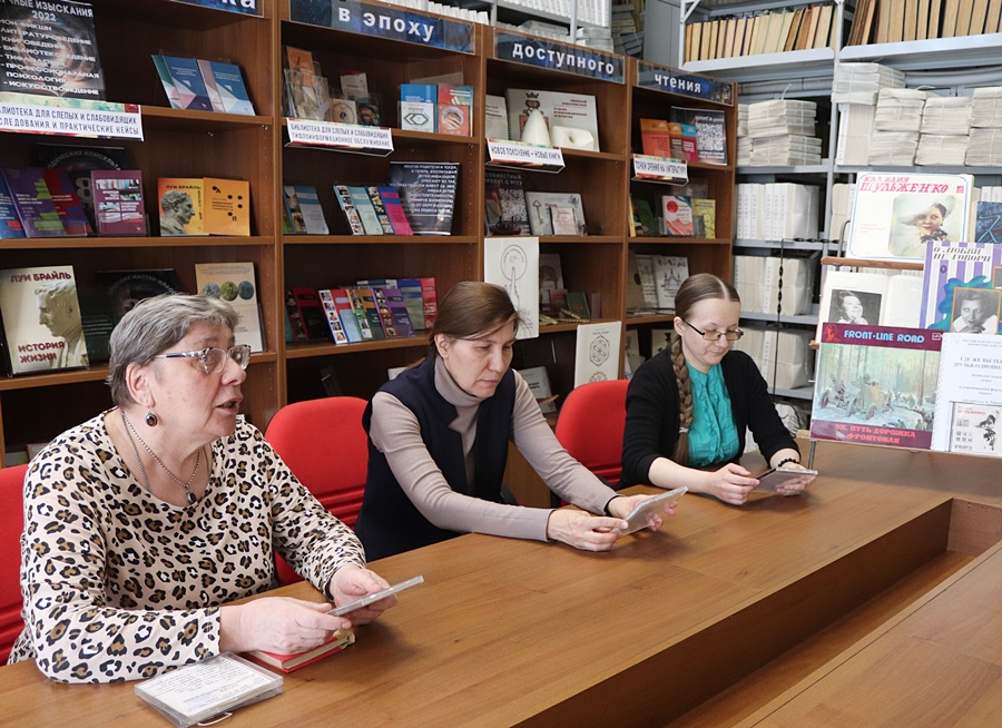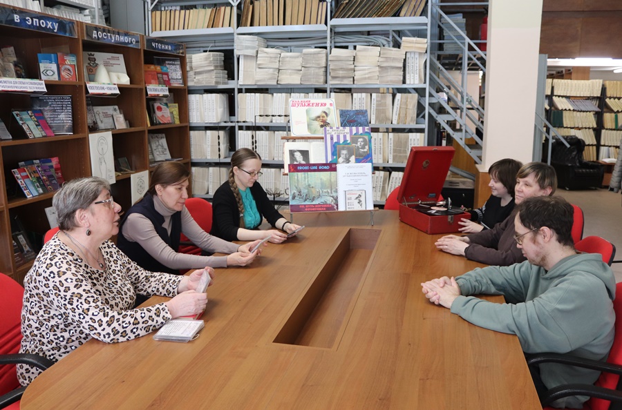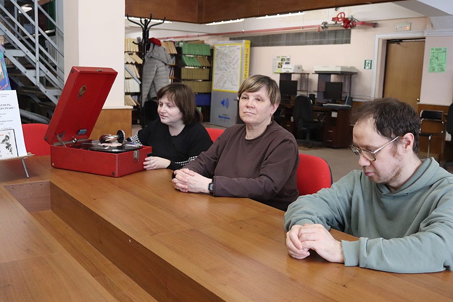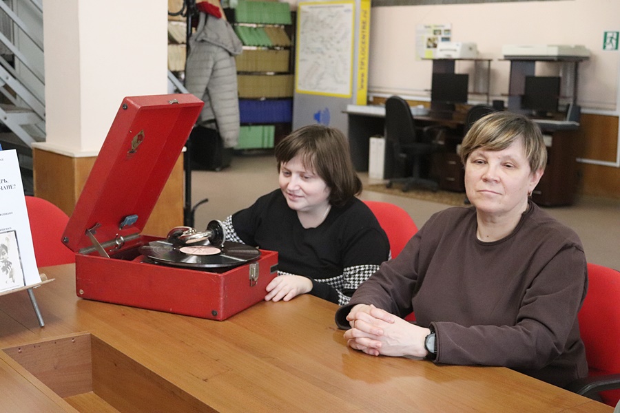 Читатели познакомились с выставкой, посвященной жизни и творчеству Клавдии Шульженко: они просматривали плоскопечатные книги, изучали фотографии и ноты. Особое внимание привлек патефон, который изучали слепые и слабовидящие, а затем прослушали рассказ о жизни и творчестве Клавдии Ивановны и архивные записи песен в ее исполнении.