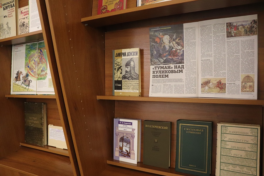 Первое описание этих событий ХIV века, ставших важнейшей вехой в истории объединения великорусских земель вокруг Москвы, дал один из крупнейших историков петровского времени Василий Татищев. Дальнейшее развитие данная тема получила в работах Николая Карамзина, Сергея Соловьева, Василия Ключевского. Это грандиозное событие привлекало пристальное внимание и последующие поколения историков и филологов. Их монографии, статьи, научно-популярные книги широко представлены на выставке. Среди них: «Сказания и повести о Куликовской битве» (отв. Ред. Д. Лихачев); «Памятники общественной мысли Древней Руси» (составитель И. Данилевский); сборник статей «Куликовская битва в литературе и искусстве»; А. Амелькин, Ю. Селезнев «Куликовская битва в свидетельствах современников и памяти потомков», О. Шафранова «Герои Куликова поля» и др.