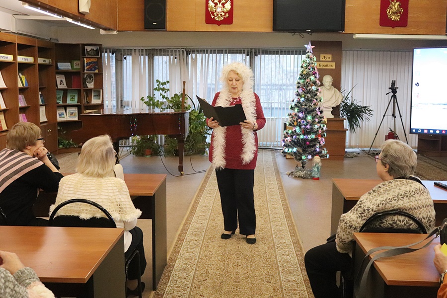 24 декабря 2025 года в читальном зале Российской государственной библиотеки для слепых состоялась праздничная программа «Сияет елочка огнями» в рамках встречи членов клуба «Друзья библиотеки». Елена Никифорова, главный библиотекарь читального зала РГБС, рассказала гостям мероприятия о традициях и обычаях празднования Нового года на Руси.