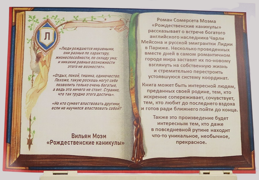 Роман Сомерсета Моэма «Рождественские каникулы» рассказывает о встрече богатого английского наследника Чарли Мейсона и русской эмигрантки Лидии в Париже. Несколько проведенных вместе дней в самом романтичном городе мира заставят их по-новому взглянуть на собственную жизнь и стремительно перестроить устоявшуюся систему координат.