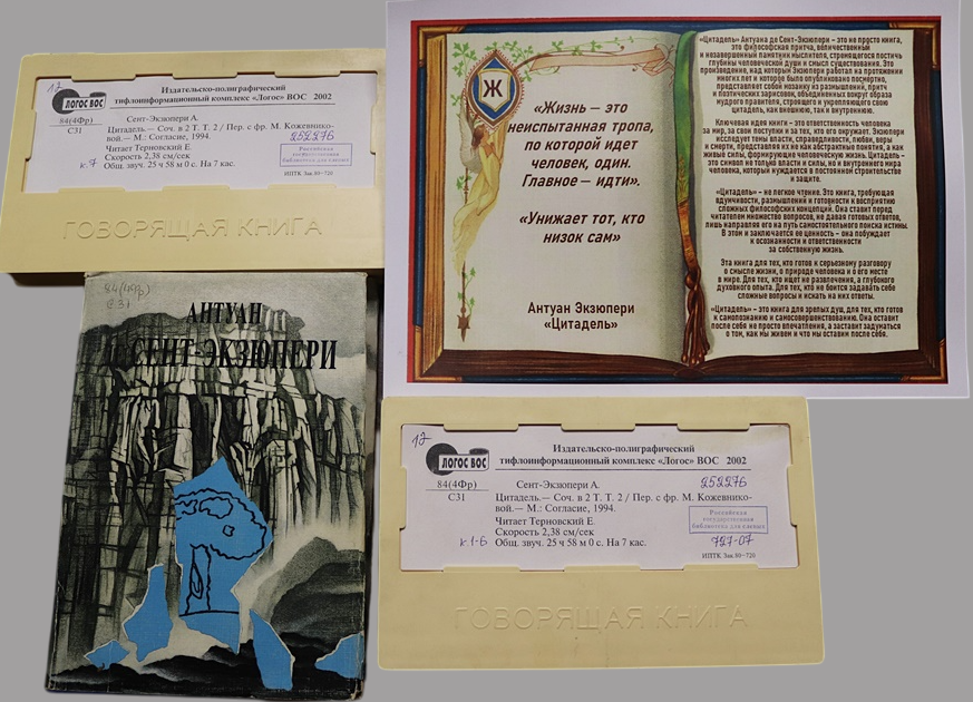 Для пользователей абонемента книга «Цитадель» доступна для чтения в плоскопечатном варианте, также ее можно прослушать на кассетах, в AV3715 и записать произведение на флеш-карту пользователя. 16+