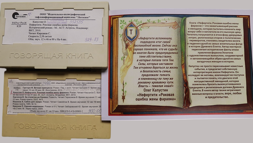 Для пользователей абонемента книга «Нефертити. Роковая ошибка жены фараона» доступна для чтения в аудиоформате на готовой флеш-карте, кассетах, в AV3715. Произведение также можно записать на флеш-карту пользователя. 16+