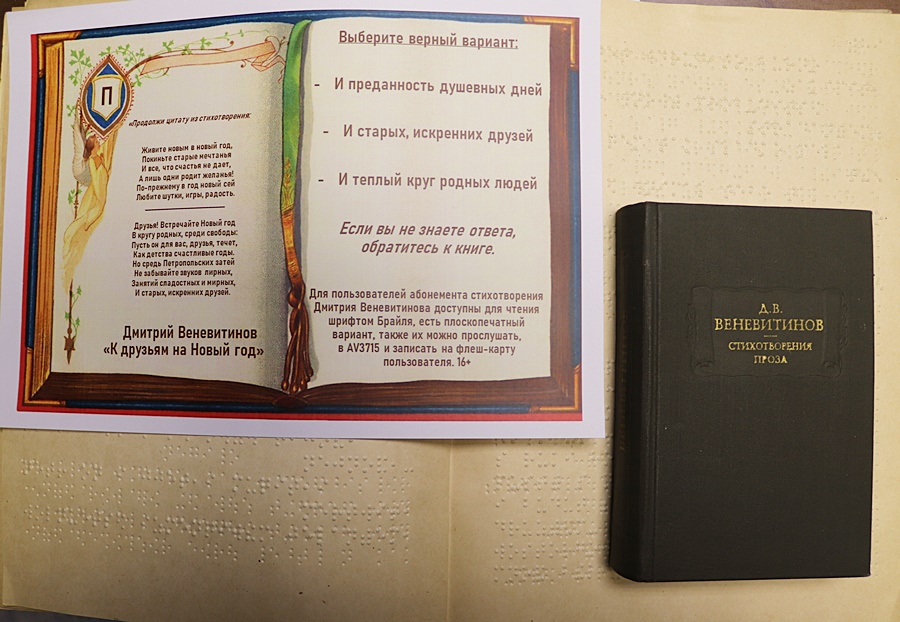 Для пользователей абонемента стихотворения Дмитрия Веневитинова доступны для чтения шрифтом Брайля, есть плоскопечатный вариант, также их можно прослушать, в AV3715 и записать на флеш-карту пользователя. 16+