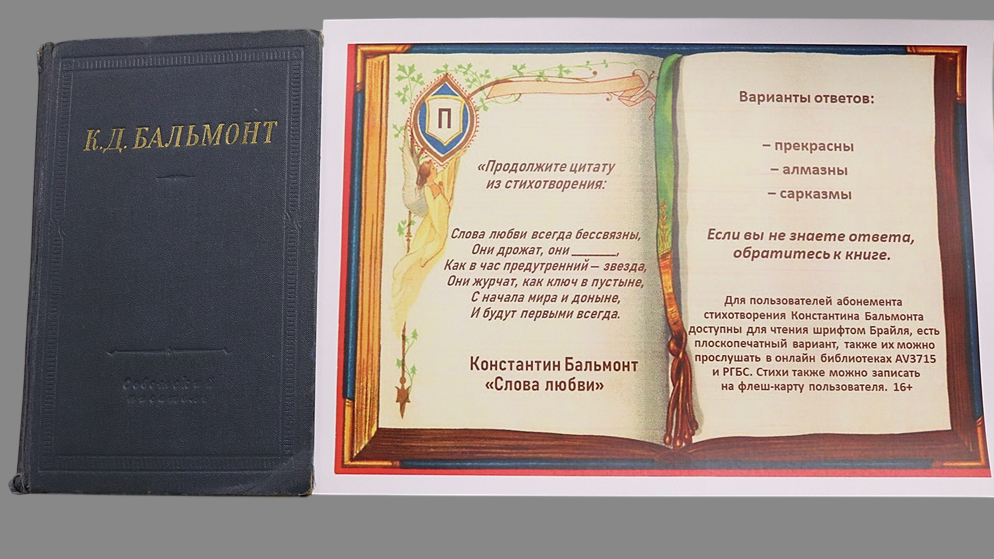 Для пользователей абонемента стихотворения Константина Бальмонта доступны для чтения шрифтом Брайля, есть плоскопечатный вариант, также их можно прослушать в онлайн библиотеках AV3715 и РГБС. Стихи также можно записать на флеш-карту пользователя. 16+