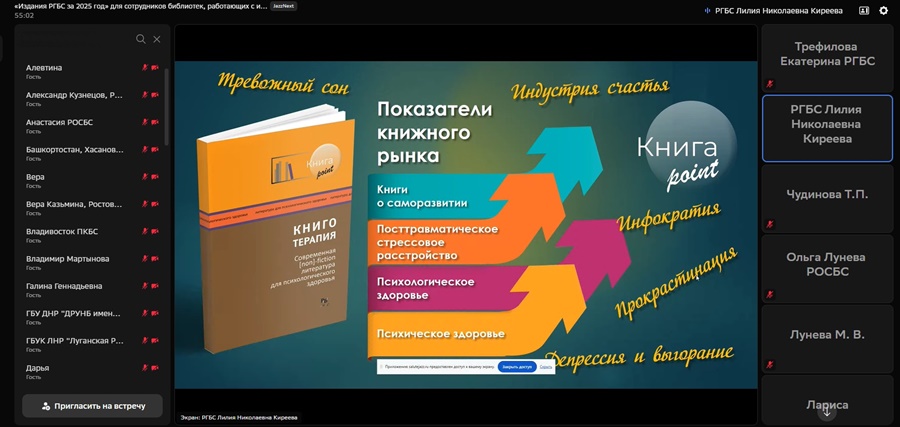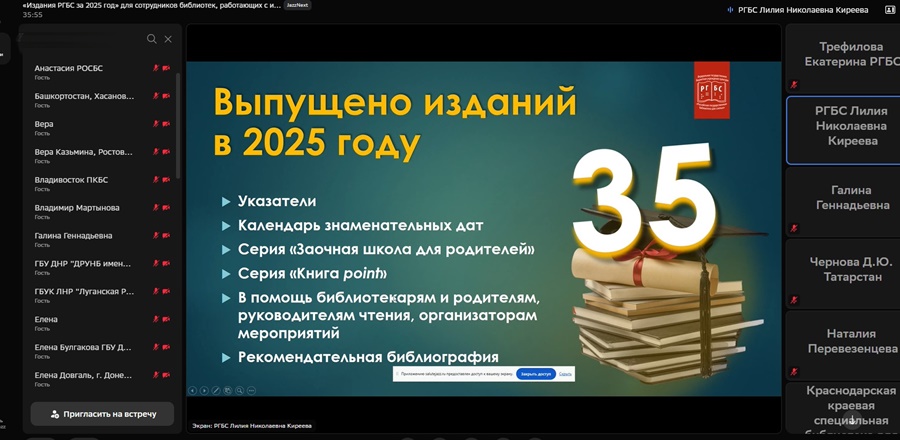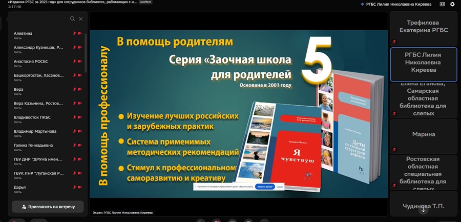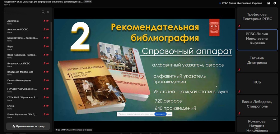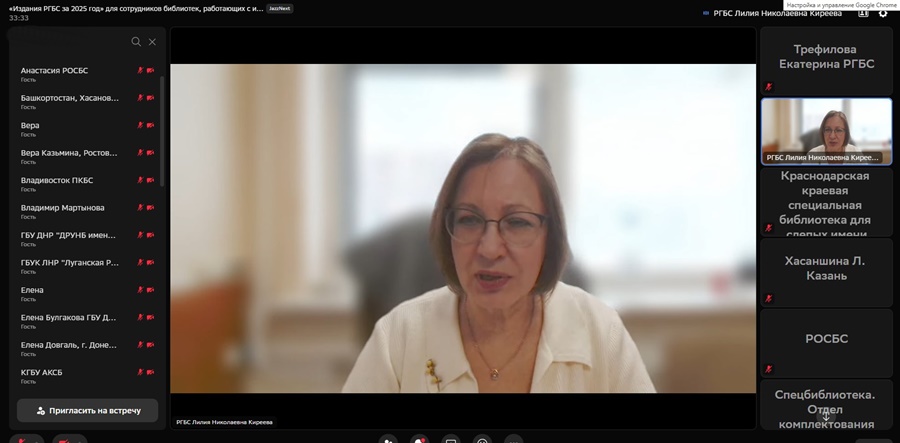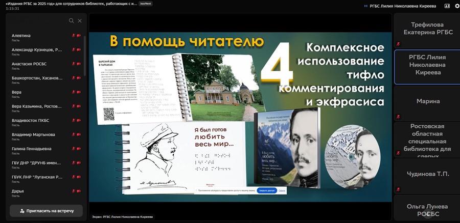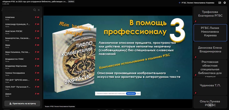 25 февраля 2026 года Российская государственная библиотека для слепых провела вебинар «Издания РГБС за 2025 год». В нем приняли участие сотрудники региональных библиотек, работающие с инвалидами по зрению и инвалидами других категорий, а также библиотекари Донецкой Народной Республики, Луганской Народной Республики и Херсонской области.