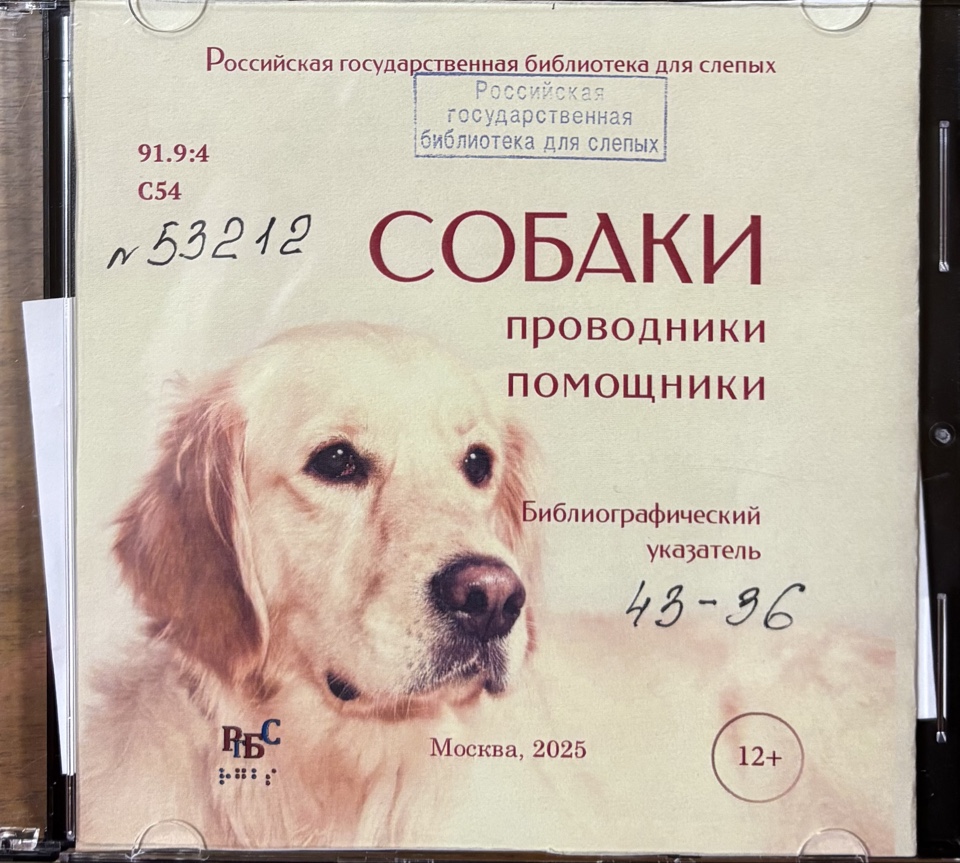 Собаки – проводники, помощники : библиографический указатель : 12+ / Российская государственная библиотека для слепых ; [составители: Л. М. Жданова, Н. В. Ягудина]. – Москва : [б. и.], 2025. – 1 электрон. опт. диск (CD-ROM). – Систем. требования: Windows 10 ; Adobe Reader DC и выше. – Загл. с этикетки контейнера. – QR-код для скачивания на диске.